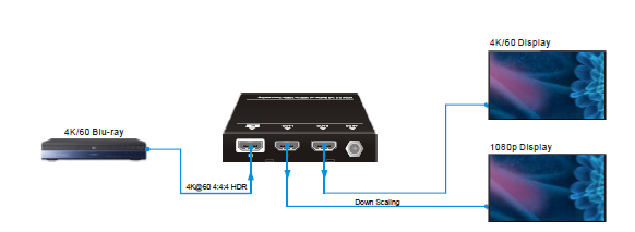 - Supports video resolution down-scaling, the 4K input can be automatically degraded to 1080P output for compatibility with 1080P displays.