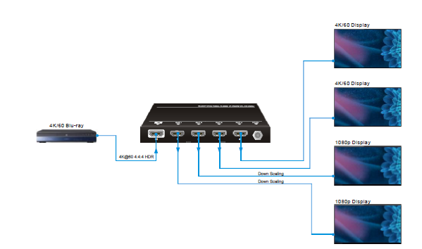- Supports video resolution down-scaling, the 4K input can be automatically degraded to 1080P output for compatibility with 1080P displays.