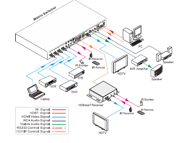 MP-HD-44A-E Kit is a professional 4K HDBaseT Home Distribution Hub Kit, which consists of a 4K HDBaseT Matrix Switcher, 3 HDBaseT Receivers and accessories. The 4K HDBaseT Matrix Switcher is a professional 4x4 HDBaseT Matrix Switcher that consist of the following inputs and outputs,4 HDMI IN (4kx2K@60Hz signal at max), 3 IR IN, 1 IR EYE, 4 IR OUT, 3 HDBaseT OUT, 1 HDMI OUT, 1 SPDIF OUT, 1 L&R RCA OUT, and TCP/IP, RS232 control port via phoenix connector. The HDBaseT Receiver is an HDBaseT Receiver that consists of the following inputs and outputs, 1 HDBaseT IN, 1 IR IN, 1 IR OUT and HDMI OUT. The receiver is powered directly by the Matrix Switcher. All HDMI inputs can be selected by either the front panel buttons, IR, RS 232 or GUI. The selected source is delivered to HDBaseT zoned outputs 1~3 & HDMI Output. The Matrix Switcher is capable of delivering 4K signals up to 40m, 1080p up to 70m and powering the receivers via a single CAT5e cable. The Matrix Switcher supports EDID management and is HDCP 2.2, 1.4 compliant. Audio sources can be selected via RS232 commands and TCP/IP at the Matrix Switcher or by 3rd Party control.