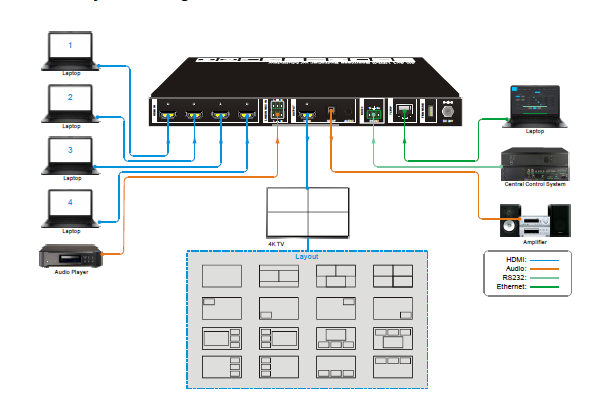 MP-SUH-41MV is a 4K Multiview switcher. It is seamless video scaler designed to enable a true 4K display.It features four HDMI inputs and one HDMI output which allows you to display four video sources on one display. It also provides a line input , 1 mix input, 1 SPDIF output and 1 analog output for audio processing. Control is quick and comprehensive, whether you are using the front panel, the remote control, RS232 commands, or the fully featured web GUI.