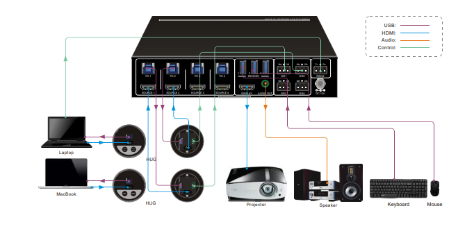 - Controls four HDMI computers via one keyboard, one mouse, and one monitor