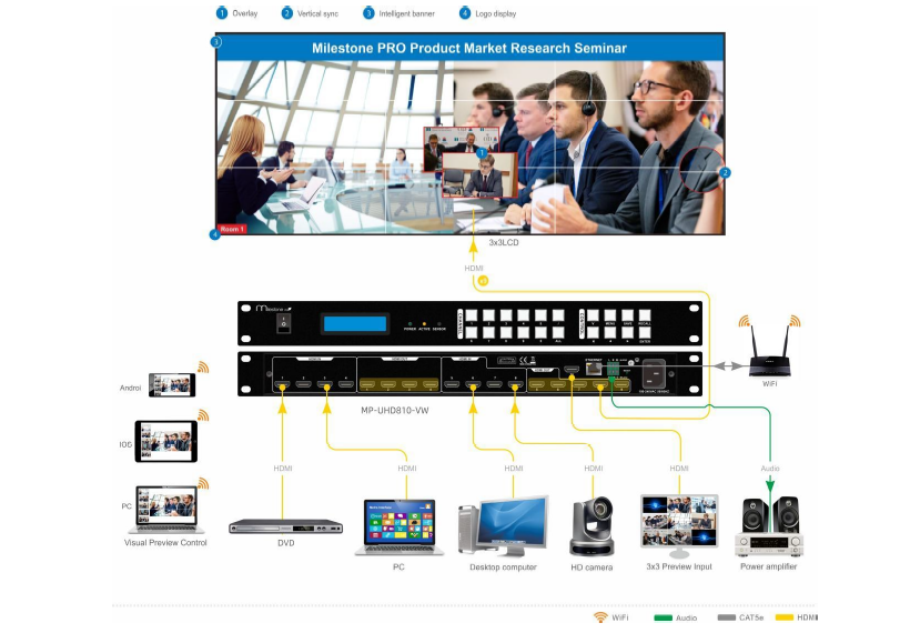 - Built-in IP-based visual preview enables real-time monitoring of input signals and displays the current video wall status.