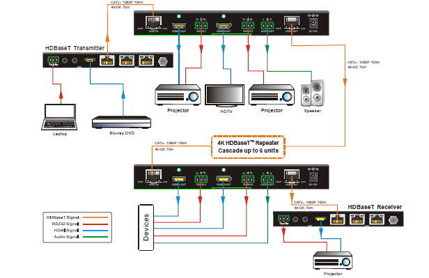 - HDBT ports with distance up to 328ft. (100m) at 1080p and 230ft. (70m) at 4Kx2K over CAT5e/6/7.