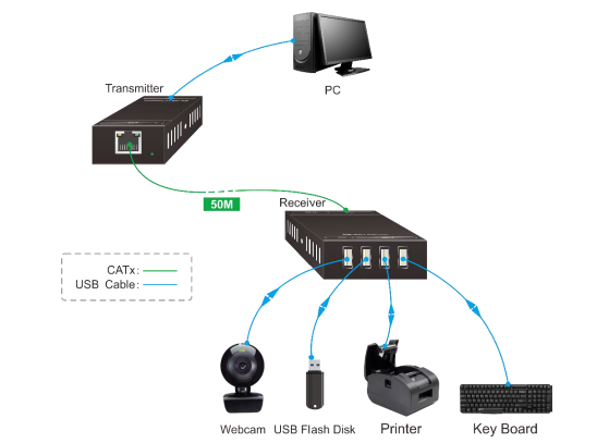 MPTP-TU50S extender kit which consists of a transmitter (Tx) and a receiver (Rx). It serves as a four in one USB hub and extends USB 2.0 signal up to 50 meters over a Cat5e/6/7 cable. The transmitter is powered by the computer and the power supply is at the remote receiver that’s helps provide sufficient power to any type of USB device, such as flash drives, keyboards, m ouses , cameras , or printers, etc. With its durable metal housing, this high quality USB extender provides a fast and flexible solution for users . In addition, the compact size enables space saving installation.
