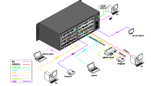 - Truly cross-point switching, any input to any output, regardless signal format.