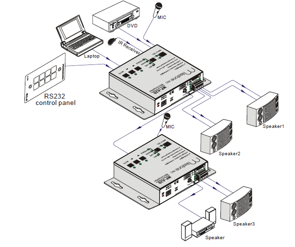 - Two stereo audio inputs, switchable by button, IR remote & RS232.