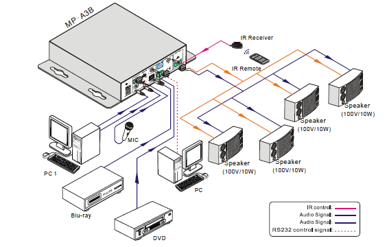 MP-A3B is a 40W Power Amplifier (Class-D) with output alternatively at 70V or 100V. It has 2 stereo inputs (1x3.5mm jack for line in, 2xRCA for L&R), 1 digital input & 1 balanced MIC. It is integrated with powerful functions, including ducking function, EQ control, MIC mixer etc, and MIC input supports 3 levels with condenser MIC, dynamic MIC & line audio input. As for power amplifier we have normally voltages at 70V and 100V for different countries, but MP-A3B is designed to integrate with both voltages to meet different requirements.