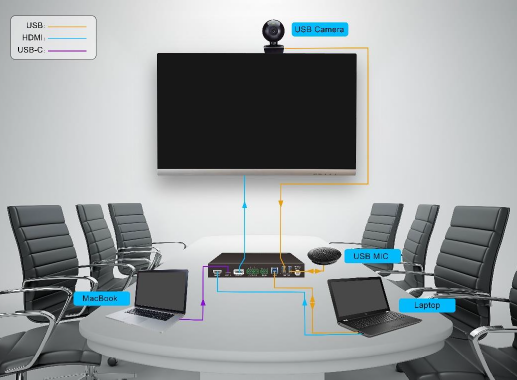 - Peripheral units (e.g. microphone and camera) can be connected by type A USB (USB 3.0/2.0) ports and automatically switched along with HDMI and USB C input as USB DEVICES for corresponding HOST.