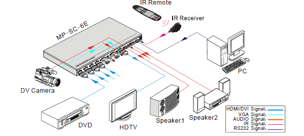 MP-SC-6E is a compact 6x1 mini unit with 6 video inputs (4 HDMI, 2 VGA), 2 auxiliary audio inputs (switched following VGA ), 1 HDMI output, and 3 audio outputs (1 dual mono analog audio, 1 3.5mm stereo audio, 1 optical audio). It switches the VGA or HDMI/DVI input signal to the HDMI output. Besides, the unit up-scales VGA to HDMI output and supports resolution adjustment (6 types in total). It bypasses HDMI and provides comprehensive resolution capacities up to 4K& 1080p 3D. The unit also supports RS232 & IR control and EDID management.
