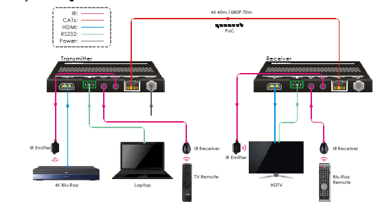 - Maximum transmission distance is up to 40m for 4Kx2K, and 70m for 1080p.