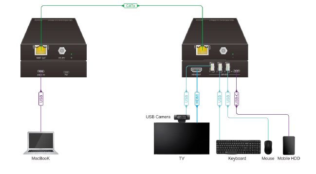MPTP-TUC-100KVM is an USB-C KVM Extender Kit that allows one USB channel to be transmitted over distances of up to 328ft(100m) at 4K@60Hz/1080p@60Hz via CATx cable. This KVM Extender Kit includes one transmitter and one receiver. The transmitter features one USB-C input and one HDBT output. For the USB-C input, it provides an AV ideal interface for connecting to the Macbook or other device with SlimPort output. The receiver features one HDMI output, one HDBT input and 4 USB 2.0 ports for connecting with KVM device such as camera, keyboard and mouse.